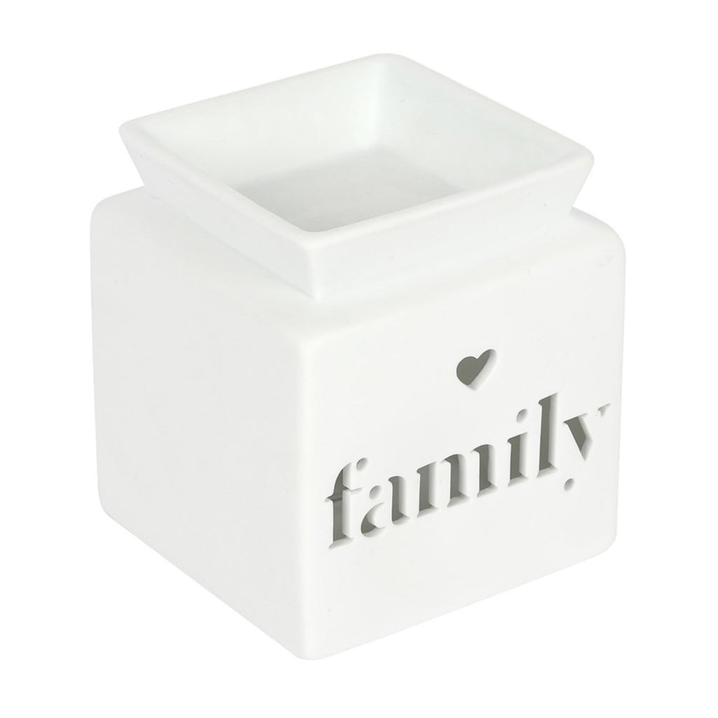 This stylish white ceramic oil burner features a cutout heart and 'family' text in a cute, contemporary design. Place wax melts into the built-in dish with a standard tea-light inside to fill the home with a calming fragrance.