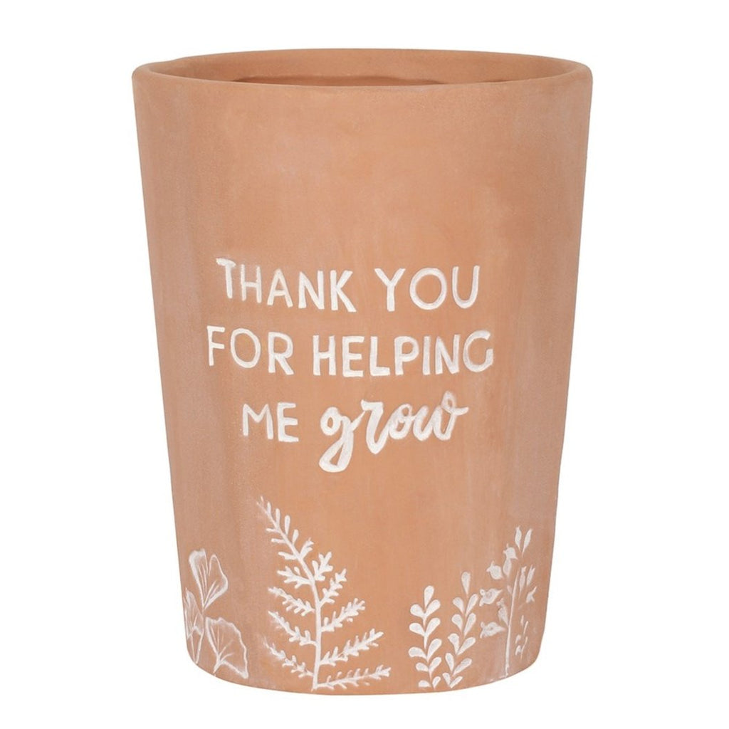 This beautiful and stylish terracotta plant pot featuring the words "Thank you for helping me grow" is a lovely gift for a green fingered new parent.