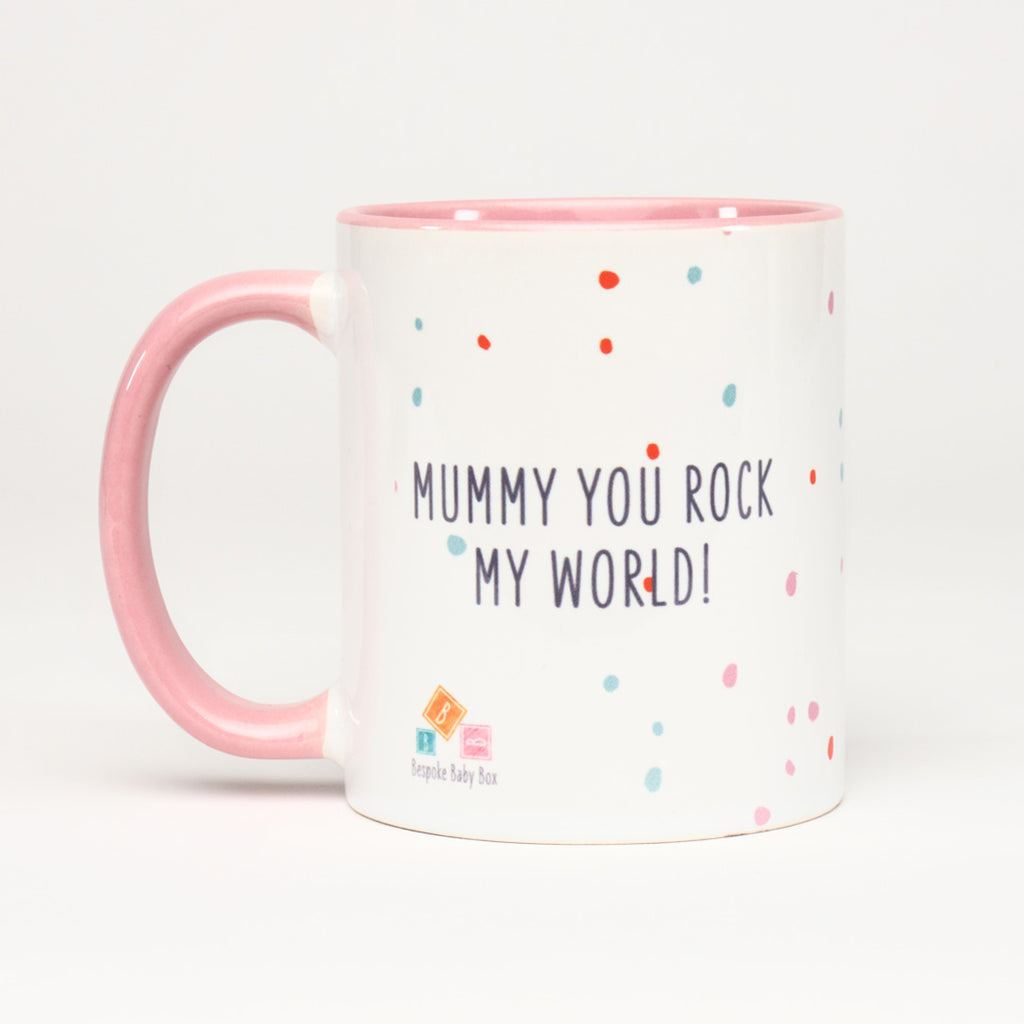 Bespoke Baby BoxEnjoy a brew in style after becoming a parent with one of our mugs. Our range of slogan mugs are a great way to put the smile back on any parents face after a sleepless night. The “Mummy you rock my world” mug has the Bespoke Baby Box pattern on the outside with a matching pink handle and inside.